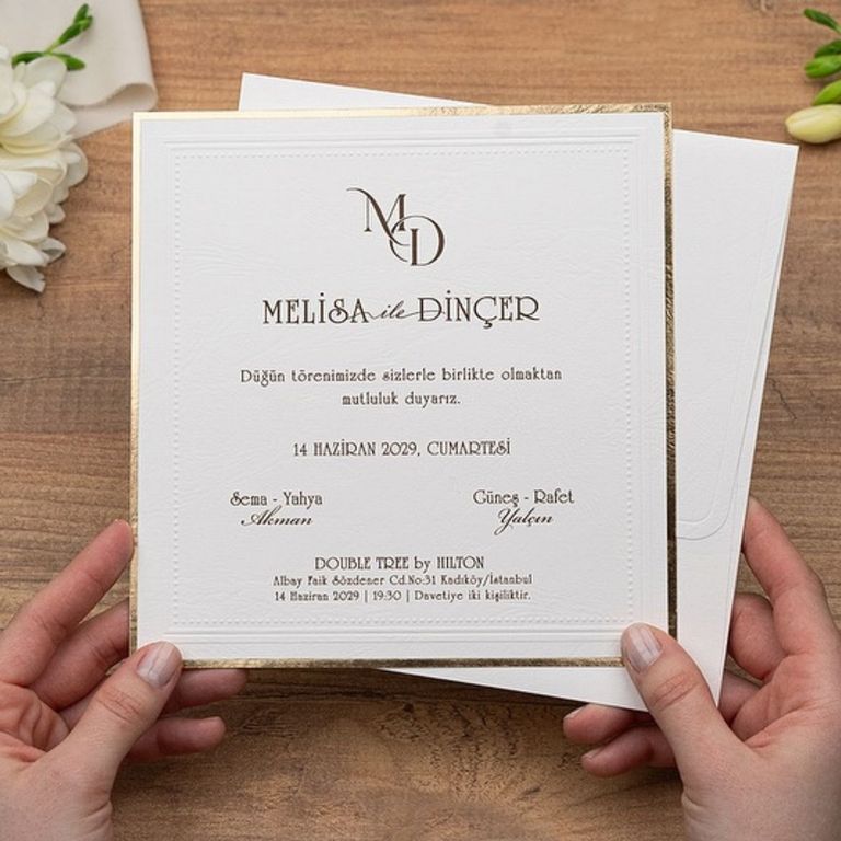 - Altın varak detayı davetiye tasarımına ışıltı ve şıklık katar.