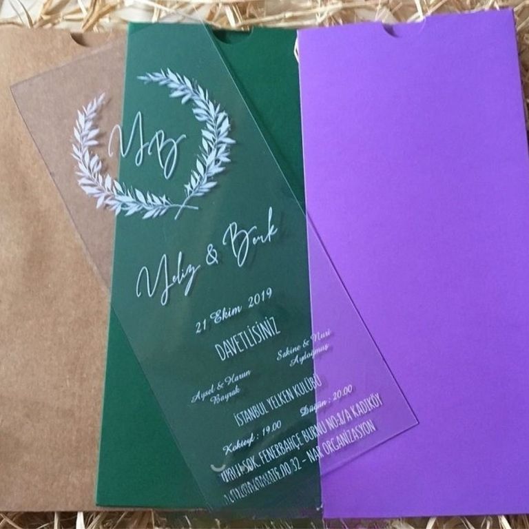 - Şeffaf davetiye, cam görünümlü yüzeyiyle modern ve hafif bir tasarım etkisi yaratır.