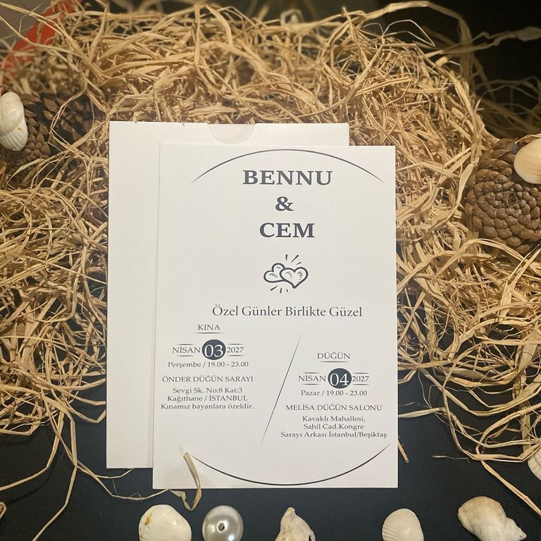 - Sade davetiye, minimal tasarımıyla yazı ve grafik detayların net şekilde öne çıkmasını sağlar.
