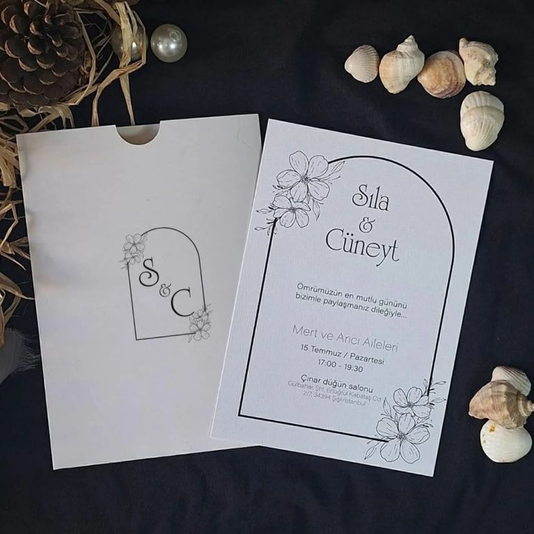 - Sade davetiye, minimal tasarımıyla yazı ve grafik detayların net şekilde öne çıkmasını sağlar.