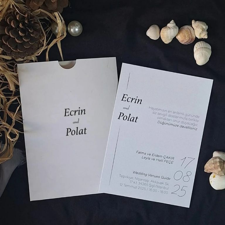 - Sade davetiye, minimal tasarımıyla yazı ve grafik detayların net şekilde öne çıkmasını sağlar.