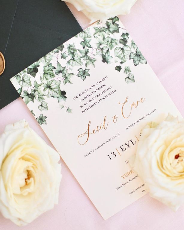 - Çiçekli davetiye, floral desenleri ve renkli detaylarıyla davete romantik ve yumuşak bir atmosfer kazandırır.