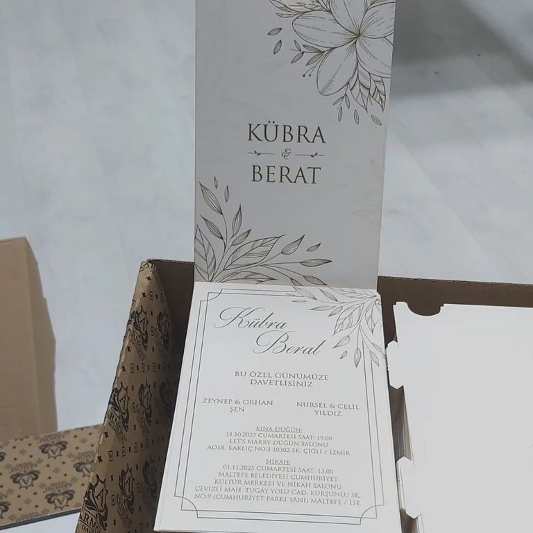 - Çiçekli davetiye, floral desenleri ve renkli detaylarıyla davete romantik ve yumuşak bir atmosfer kazandırır.