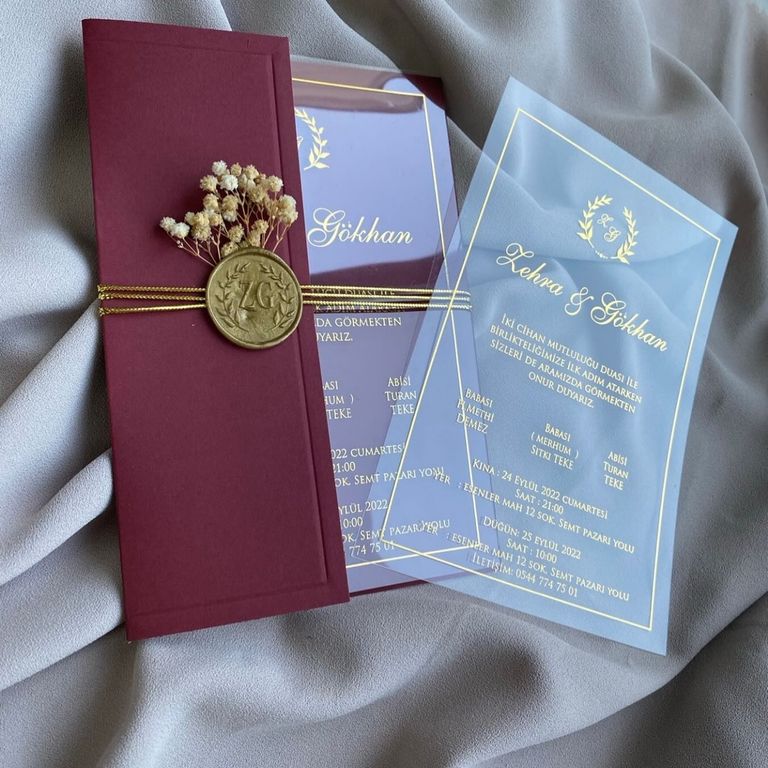 - Altın varak detayı davetiye tasarımına ışıltı ve şıklık katar.
