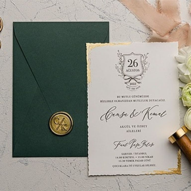 - Altın varak detayı davetiye tasarımına ışıltı ve şıklık katar.