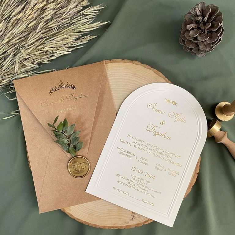 - Altın varak detayı davetiye tasarımına ışıltı ve şıklık katar.