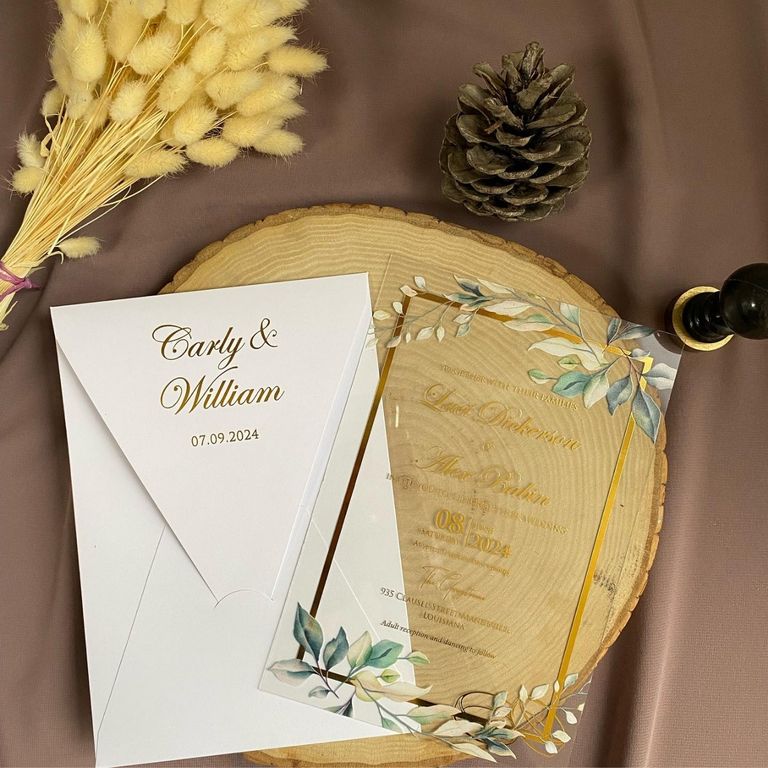 - Şeffaf davetiye, cam görünümlü yüzeyiyle modern ve hafif bir tasarım etkisi yaratır.