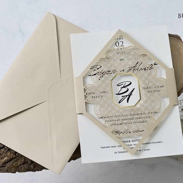 - Sade davetiye, minimal tasarımıyla yazı ve grafik detayların net şekilde öne çıkmasını sağlar.