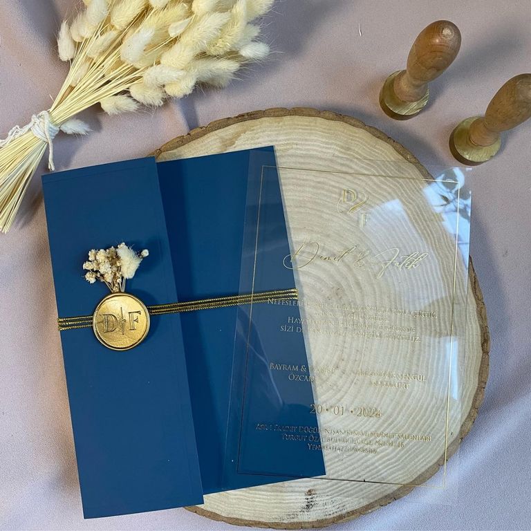 4. Şeffaf davetiye, cam görünümlü yüzeyiyle modern ve hafif bir tasarım etkisi yaratır.