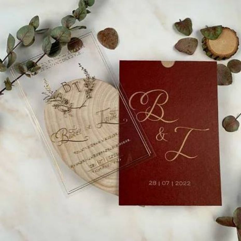 - Şeffaf davetiye, cam görünümlü yüzeyiyle modern ve hafif bir tasarım etkisi yaratır.