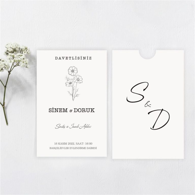 - Sade davetiye, minimal tasarımıyla yazı ve grafik detayların net şekilde öne çıkmasını sağlar.