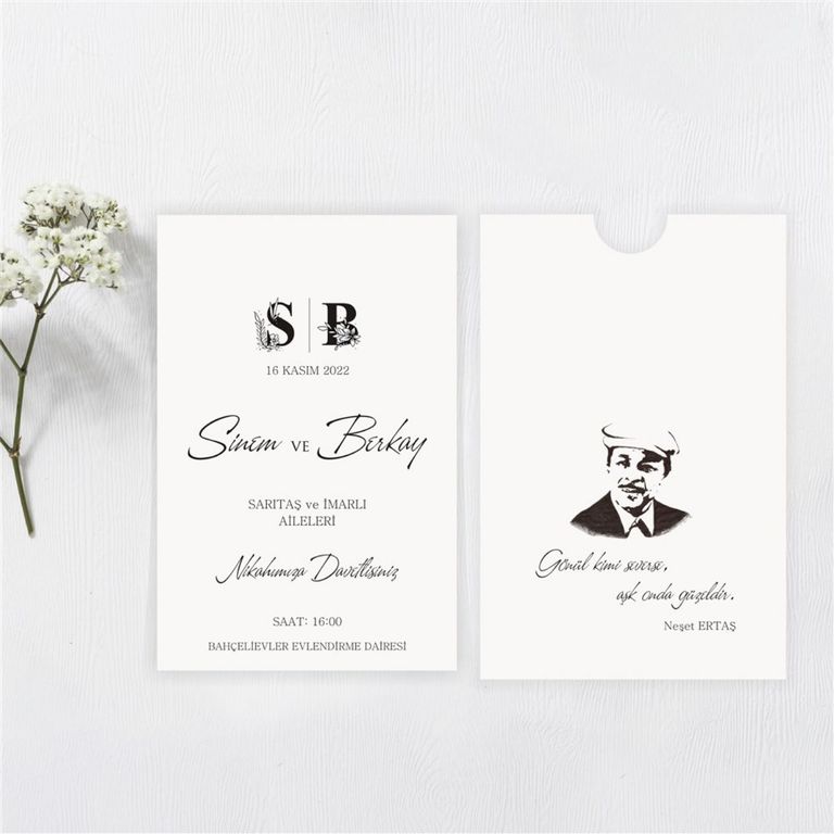 - Sade davetiye, minimal tasarımıyla yazı ve grafik detayların net şekilde öne çıkmasını sağlar.
