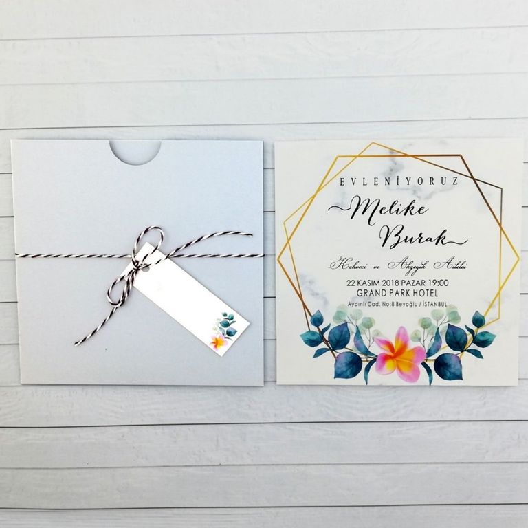 - Çiçekli davetiye, floral desenleri ve renkli detaylarıyla davete romantik ve yumuşak bir atmosfer kazandırır.