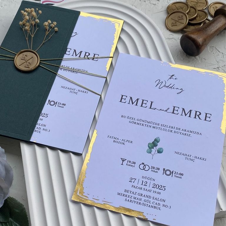 - Altın varak detayı davetiye tasarımına ışıltı ve şıklık katar.