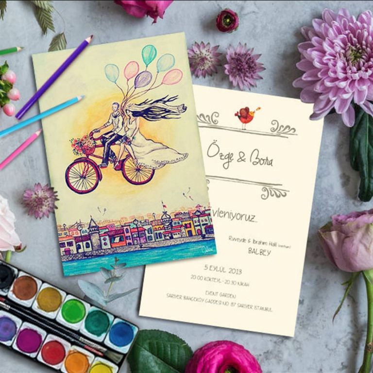- Karikatürlü davetiye, çifte özel çizimleriyle davet sürecine eğlenceli ve özgün bir karakter kazandırır.
