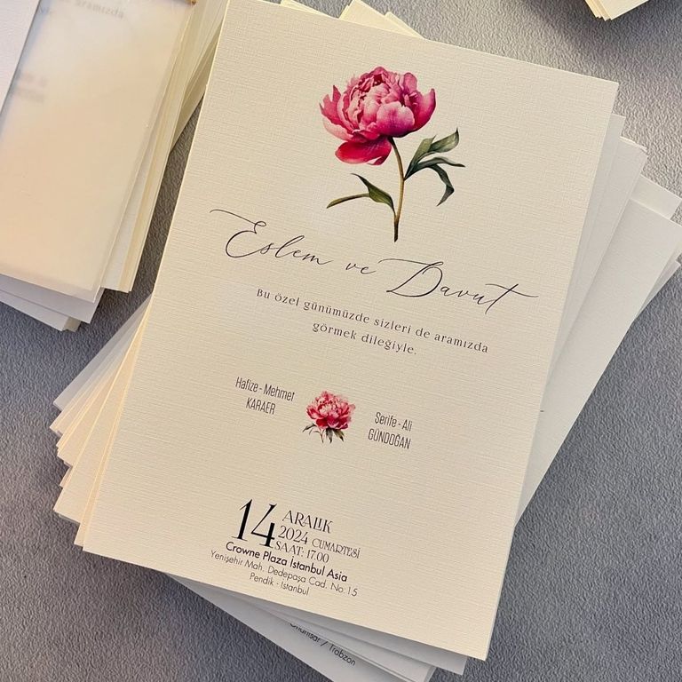 - Çiçekli davetiye, floral desenleri ve renkli detaylarıyla davete romantik ve yumuşak bir atmosfer kazandırır.