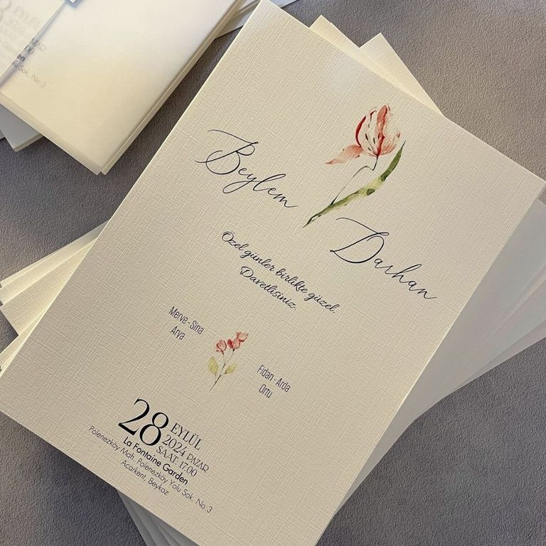 4. Çiçekli davetiye, floral desenleri ve renkli detaylarıyla davete romantik ve yumuşak bir atmosfer kazandırır.