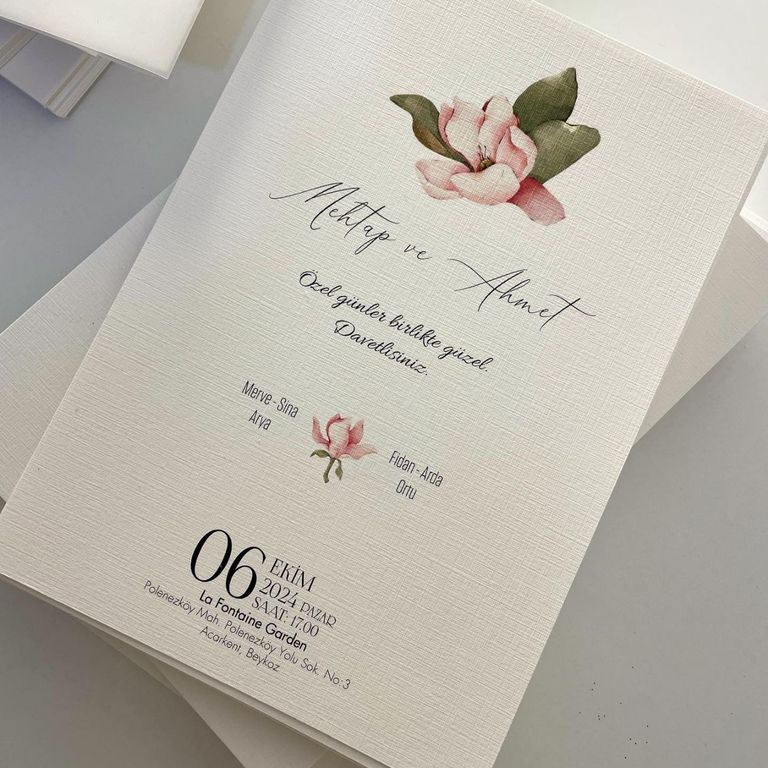4. Çiçekli davetiye, floral desenleri ve renkli detaylarıyla davete romantik ve yumuşak bir atmosfer kazandırır.