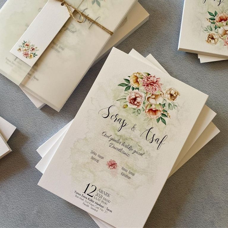 - Çiçekli davetiye, floral desenleri ve renkli detaylarıyla davete romantik ve yumuşak bir atmosfer kazandırır.