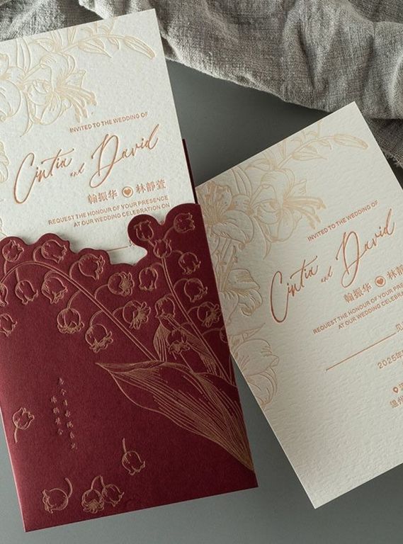 Yaprak figürü kesimli bordo davetiye