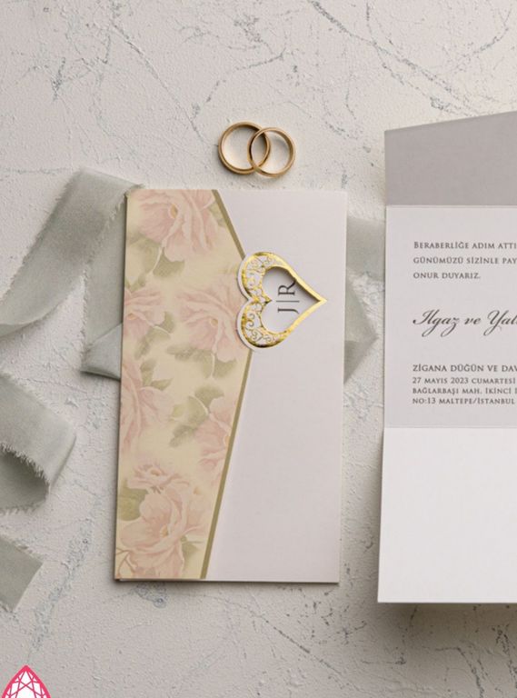 Romantik tarzda, yarım çiçek desenli davetiye