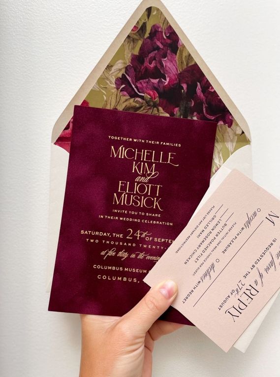 Kadife davetiye, dokulu yüzeyi sayesinde elde hissedilen sıcak ve lüks bir etki oluşturur.