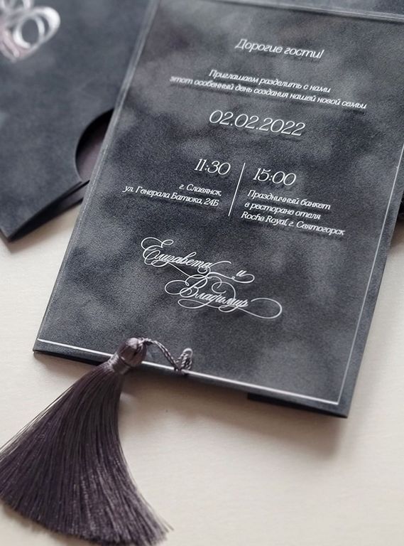 Kadife dokulu püskül detaylı antrasit davetiye