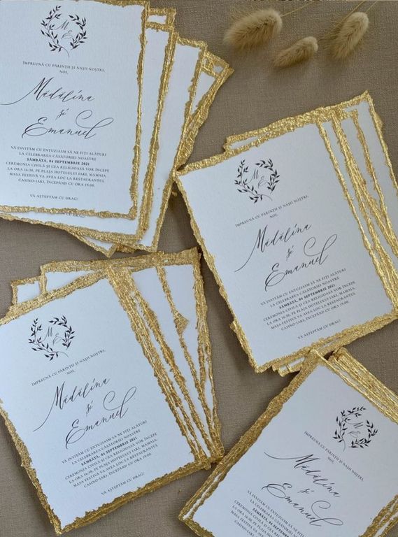 Altın varak detayı davetiye tasarımına ışıltı ve şıklık katar.