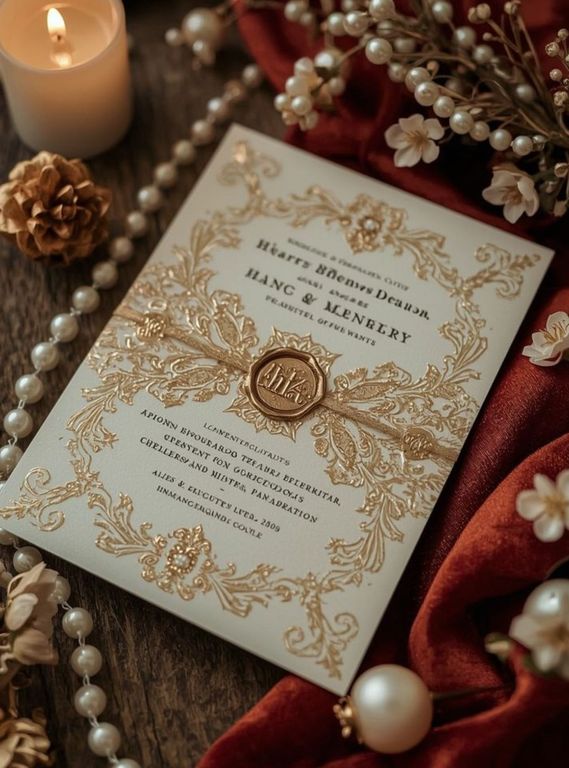 Altın Varaklı Mühürlü Düğün Davetiye