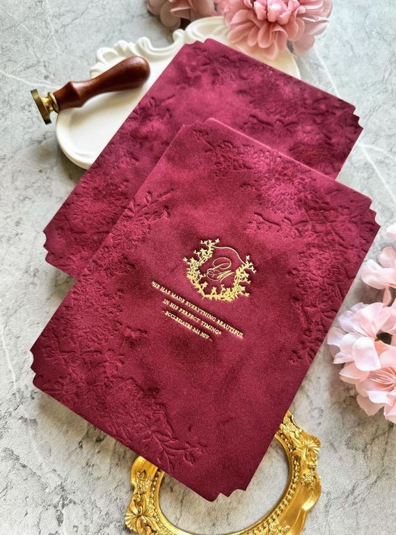Kırmızı renkte, altın varaklı baskılı, kadife dokulu davetiye