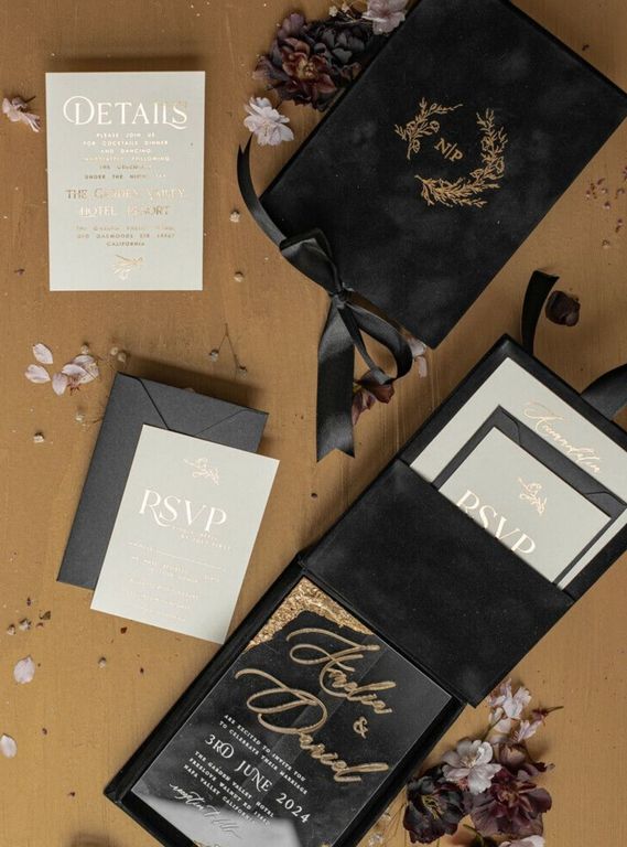 Altın varaklı, şeffaf, kadife dokulu davetiye