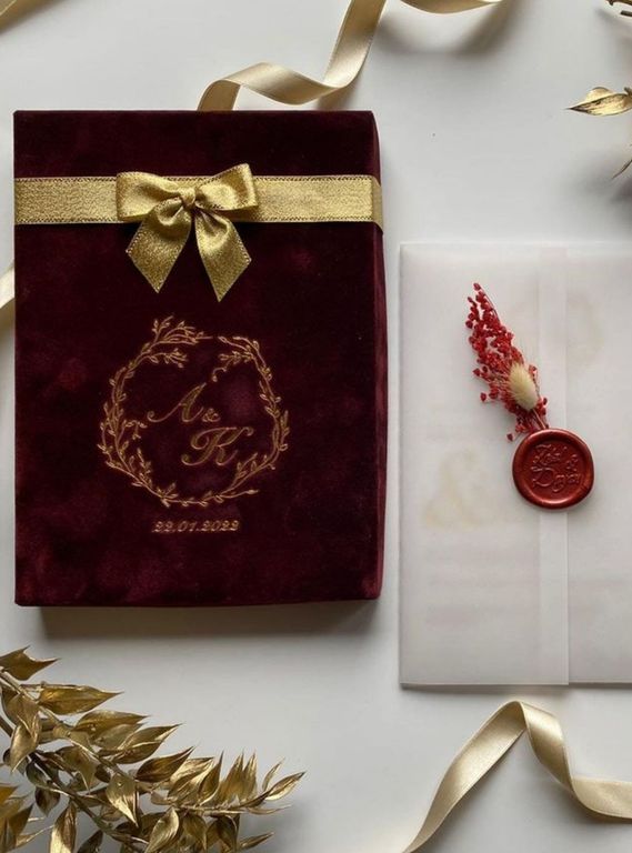 Bordo renkte, kadife dokulu davetiye