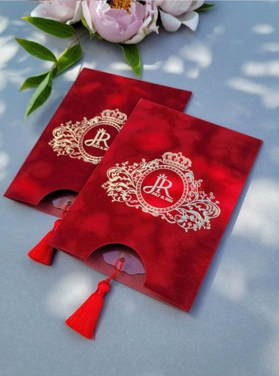 Altın varaklı, kırmızı kadife dokulu davetiye