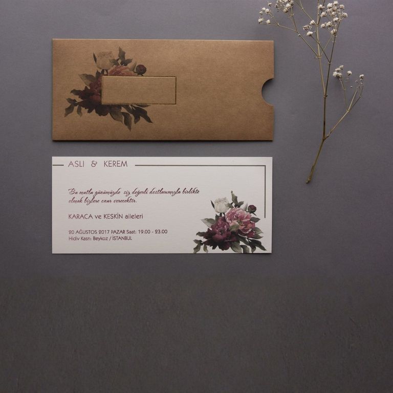 - Çiçekli davetiye, floral desenleri ve renkli detaylarıyla davete romantik ve yumuşak bir atmosfer kazandırır.