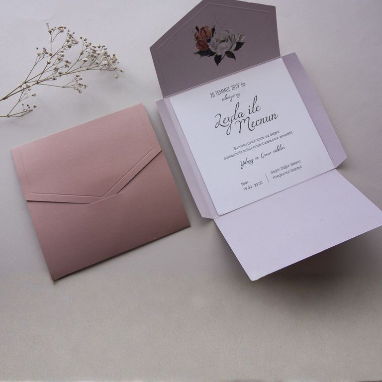 - Çiçekli davetiye, floral desenleri ve renkli detaylarıyla davete romantik ve yumuşak bir atmosfer kazandırır.