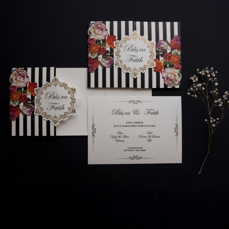 - Çiçekli davetiye, floral desenleri ve renkli detaylarıyla davete romantik ve yumuşak bir atmosfer kazandırır.