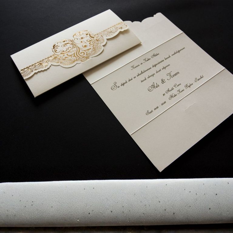 - Altın varak detayı davetiye tasarımına ışıltı ve şıklık katar.