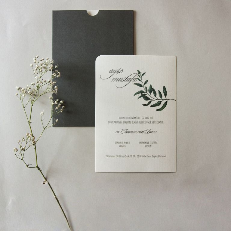 - Sade davetiye, minimal tasarımıyla yazı ve grafik detayların net şekilde öne çıkmasını sağlar.