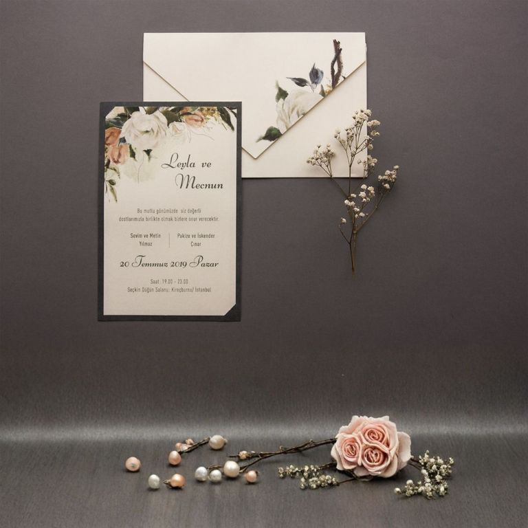 - Çiçekli davetiye, floral desenleri ve renkli detaylarıyla davete romantik ve yumuşak bir atmosfer kazandırır.