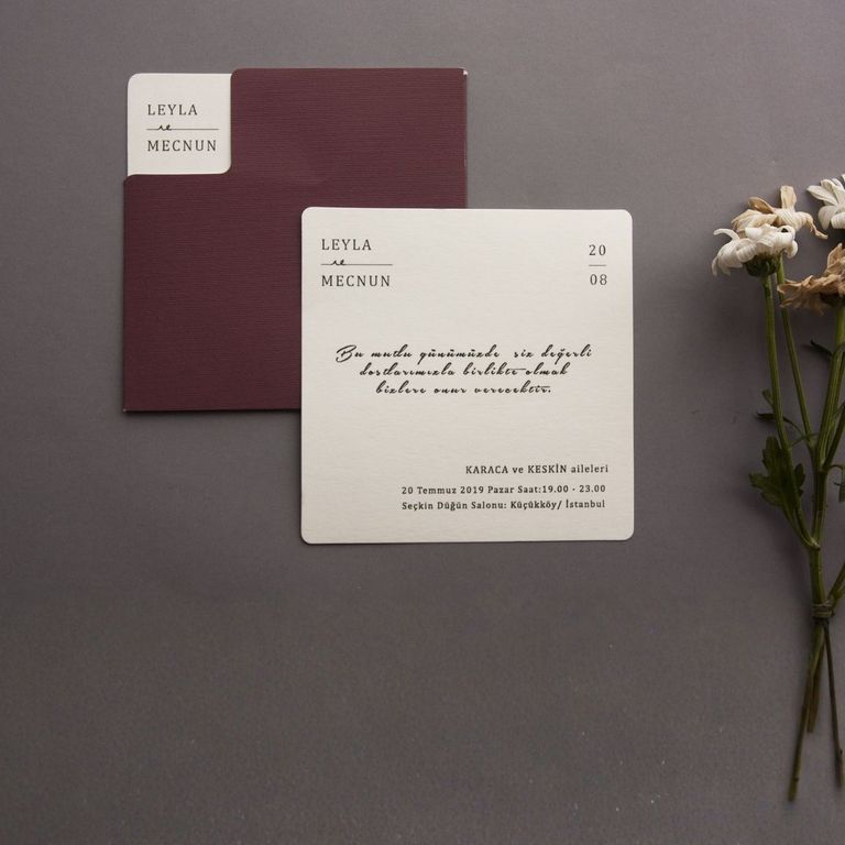 - Sade davetiye, minimal tasarımıyla yazı ve grafik detayların net şekilde öne çıkmasını sağlar.