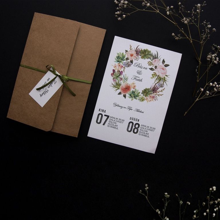 - Çiçekli davetiye, floral desenleri ve renkli detaylarıyla davete romantik ve yumuşak bir atmosfer kazandırır.