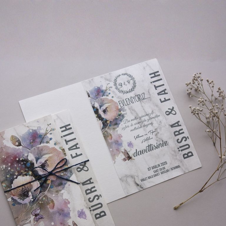 - Çiçekli davetiye, floral desenleri ve renkli detaylarıyla davete romantik ve yumuşak bir atmosfer kazandırır.