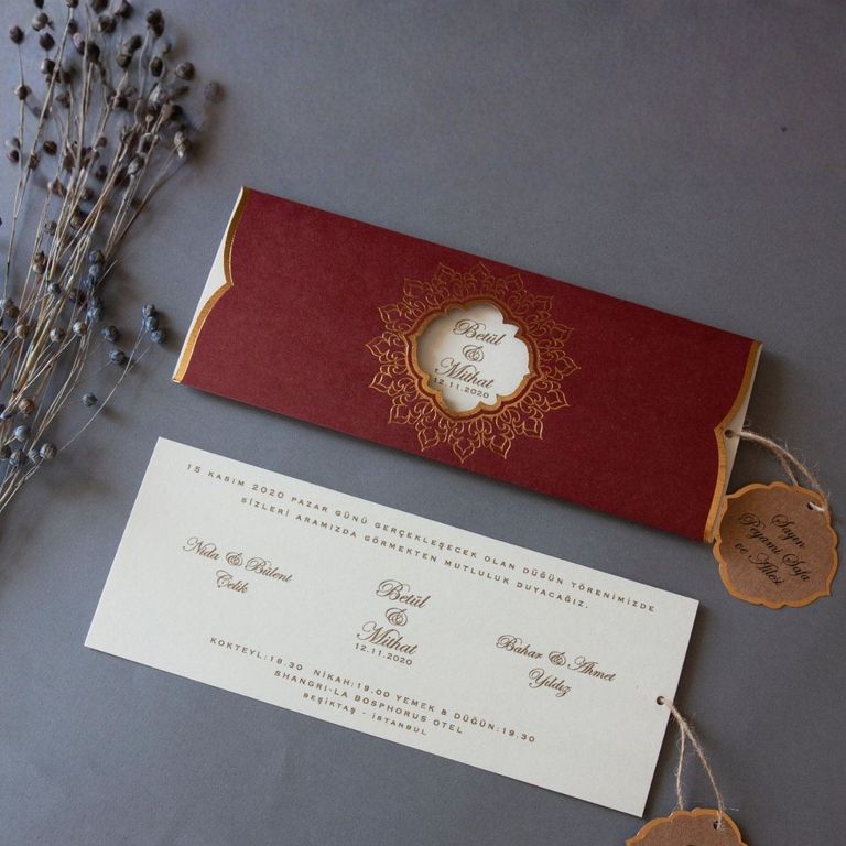 - Altın varak detayı davetiye tasarımına ışıltı ve şıklık katar.