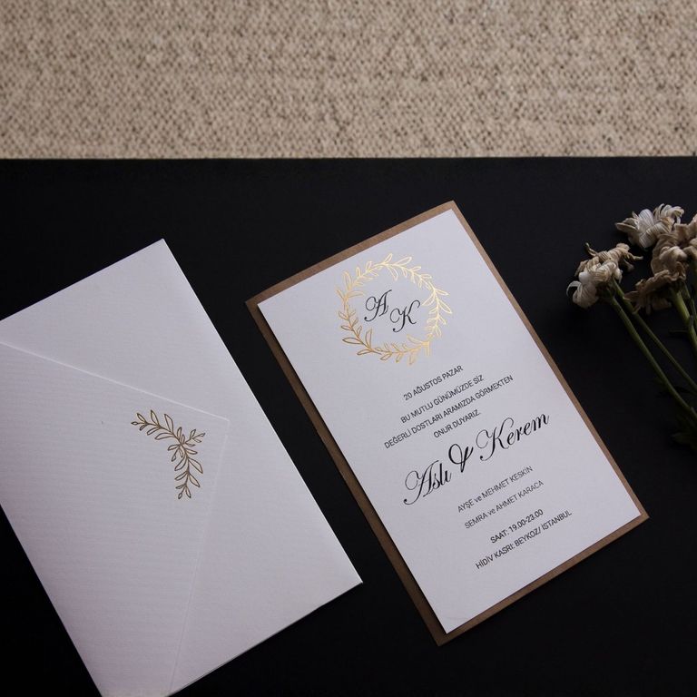 - Altın varak detayı davetiye tasarımına ışıltı ve şıklık katar.