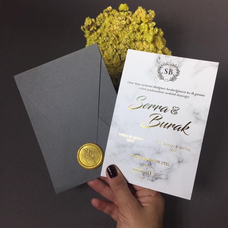 - Altın varak detayı davetiye tasarımına ışıltı ve şıklık katar.