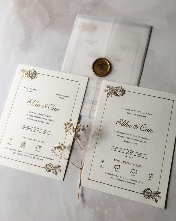- Altın varak detayı davetiye tasarımına ışıltı ve şıklık katar.