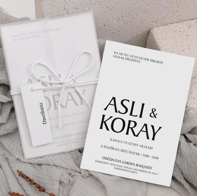 1. Sade davetiye, minimal tasarımıyla yazı ve grafik detayların net şekilde öne çıkmasını sağlar.