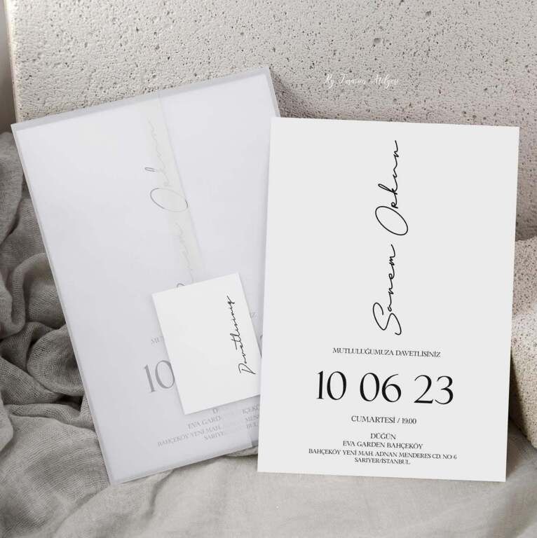 Sade davetiye, minimal tasarımıyla yazı ve grafik detayların net şekilde öne çıkmasını sağlar.