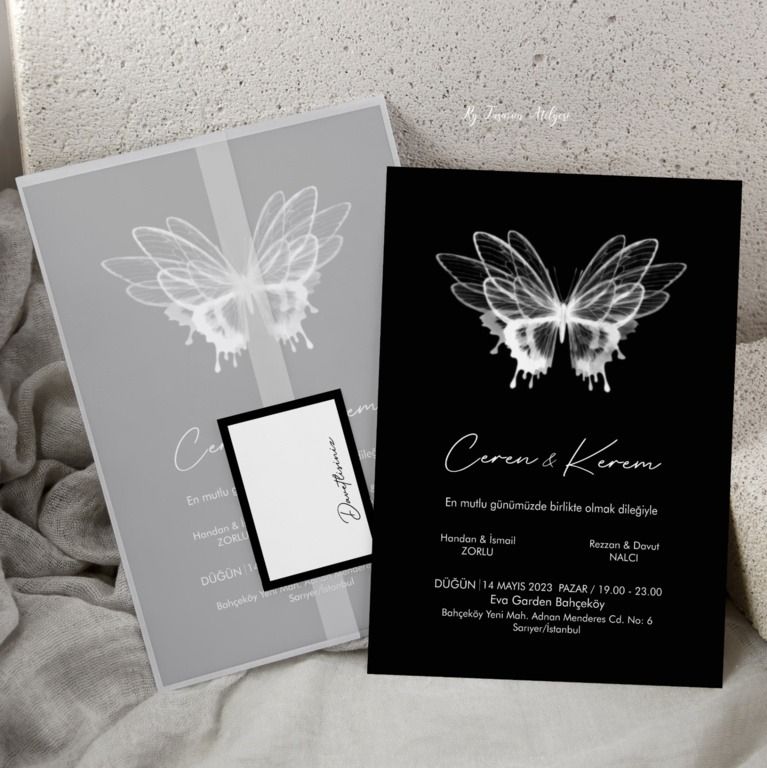 - Sade davetiye, minimal tasarımıyla yazı ve grafik detayların net şekilde öne çıkmasını sağlar.