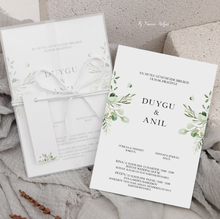 Şeffaf zarflı, yeşil yaprak detaylarıyla hareketlendirilmiş sade davetiye
